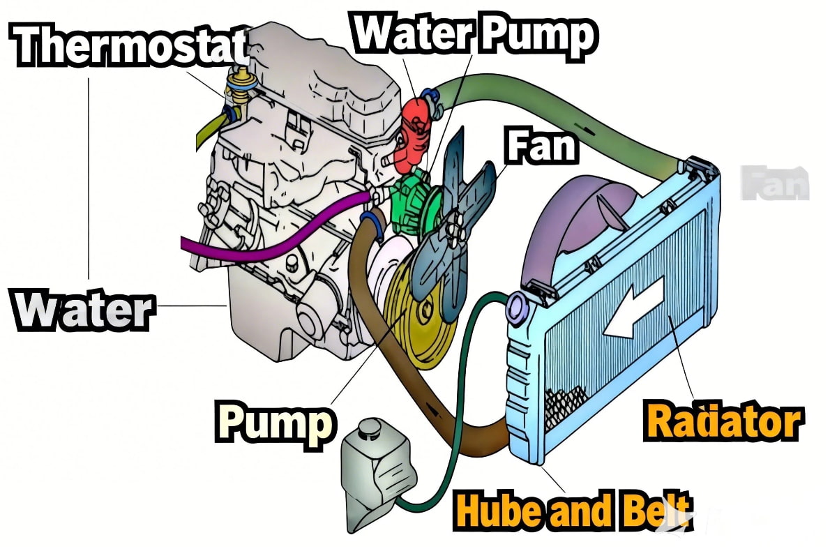 (1) Компоненты системы охлаждения: термостат управляет циркуляцией охлаждающей жидкости (малый контур для быстрого прогрева, большой контур для повышения эффективности рассеивания тепла); водяной насос, радиатор и вентилятор обеспечивают эффективность циркуляции охлаждающей жидкости и способность рассеивать тепло.